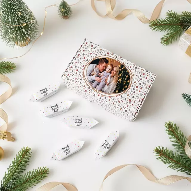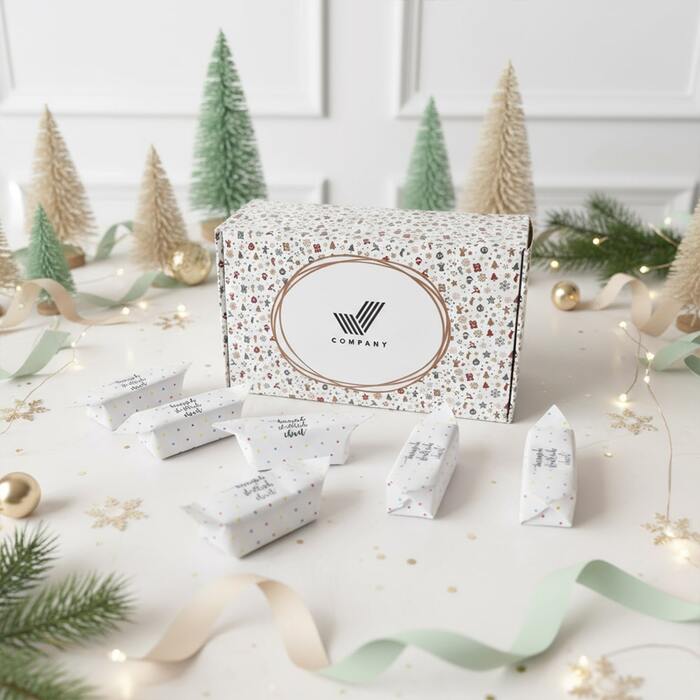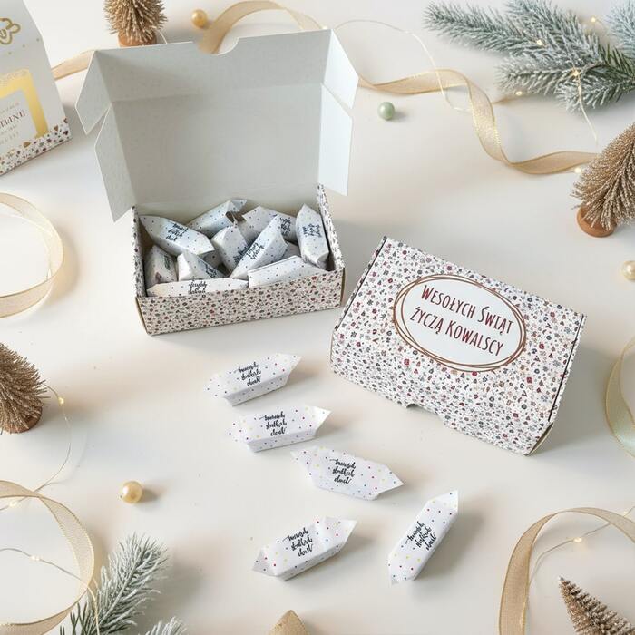 O wymiarach 13,5 × 8 × 4,5 cm, doskonale pomieszczą ok. 200 g krówek lub Michałków, a także inne drobiazgi – od świeczek i pralinek po mini kosmetyki, biżuterię czy firmowe upominki. Idealne na świąteczne prezenty, weselne podziękowania, eventy firmowe lub jako eleganckie opakowanie sprzedażowe.