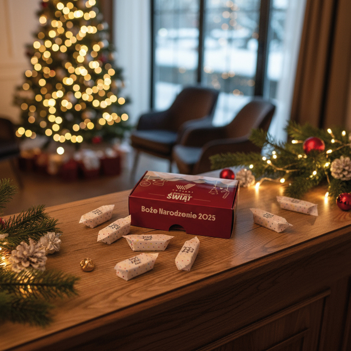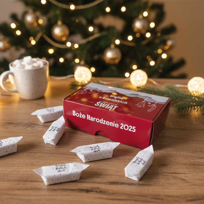 O wymiarach 13,5 × 8 × 4,5 cm, doskonale pomieszczą ok. 200 g krówek lub Michałków, a także inne drobiazgi – od świeczek i pralinek po mini kosmetyki, biżuterię czy firmowe upominki. Idealne na świąteczne prezenty, weselne podziękowania, eventy firmowe lub jako eleganckie opakowanie sprzedażowe.