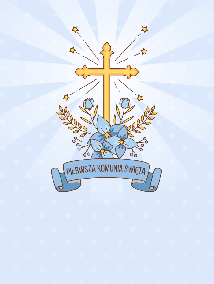 Komunia Święta ma wiele symboli, które śmiało można wkomponować w tło pamiątkowego plakatu. Dzisiejsza propozycja to kłosy zboża, krzyż i kwiaty na niebieskim tle.