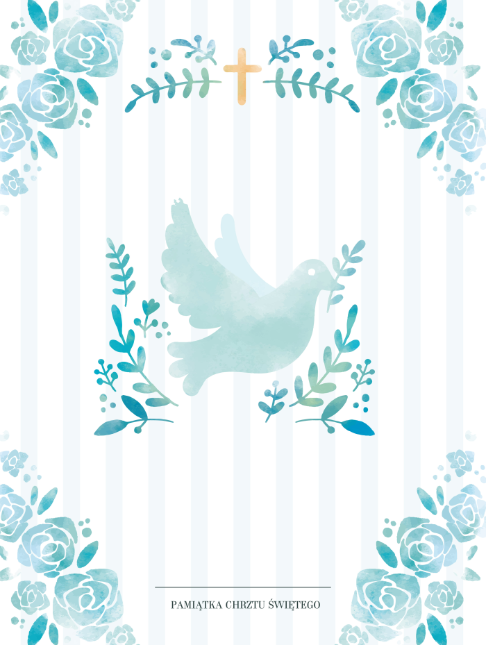 Niebiański gołąb symbolizujący czystość i niewinność w towarzystwie cudownych róż. W takiej formie plakat jest idealną pamiątką Chrztu Św.