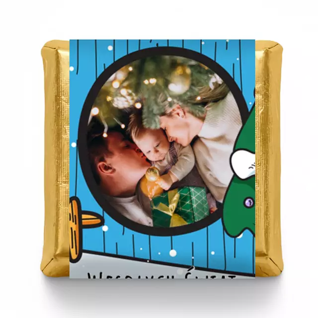 Każdą czekoladkę jest zapakowana w złotą folię i dodajemy etykietę z Twoim własnym projektem. Może to być zdjęcie rodzinne, logo firmy, życzenia świąteczne albo zabawny tekst – Ty decydujesz, jak będzie wyglądał Twój słodki upominek.